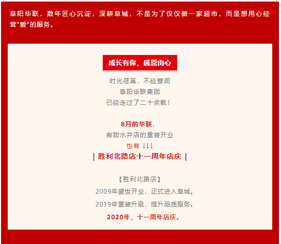 全城沸騰!|| 8月8日值得慶賀的事件太多!阜陽華聯(lián)勝利北路店十一周年店慶最香!