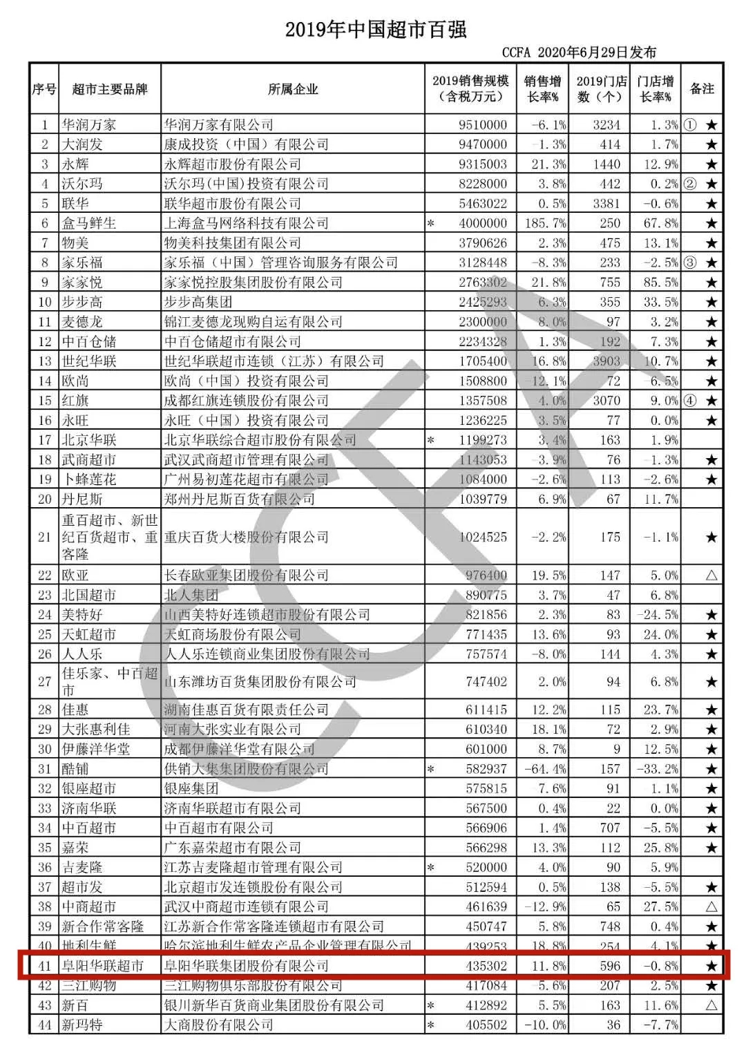 2019年中國(guó)超市百?gòu)?qiáng)出爐 阜陽(yáng)華聯(lián)上升至第41位