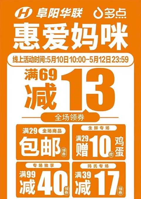 【阜陽華聯(lián)】母親節(jié)專場(chǎng)獨(dú)享99減40,還免費(fèi)送雞蛋!