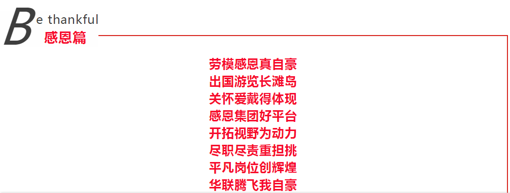 感悟:強(qiáng)大的阜陽(yáng)華聯(lián)集團(tuán)賦予了我們一切的感激和奮進(jìn)的源泉,我又有什么理由不已行動(dòng)去感恩回報(bào)企業(yè)呢?唯有為阜陽(yáng)華聯(lián)的發(fā)展發(fā)一份光、散一份熱,努力奮斗!