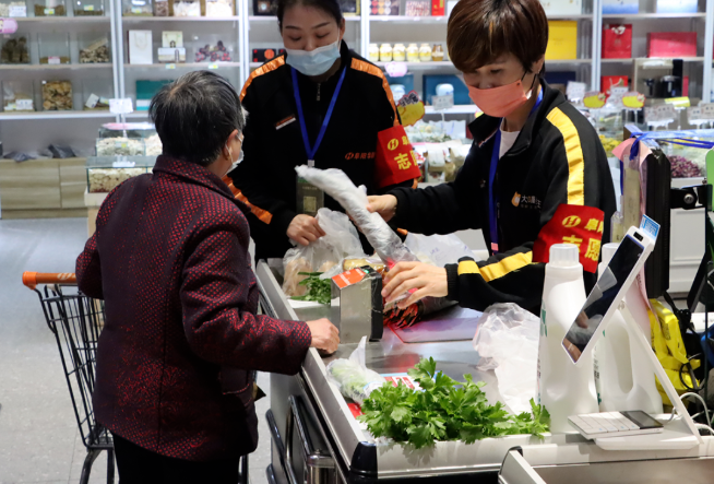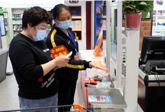 收銀區(qū)設置一米線,并時刻提醒顧客保持距離,如果有年長者行動緩慢或操作不當,延長收銀時間,就會引起收銀長龍,志愿者們幫助顧客,能迅速縮短收銀時間。