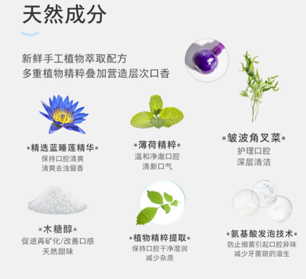 香型:前調(diào)--印度薄荷,后調(diào)--復合花語功能:喚醒口原生能量 賦予口腔清新動力         祛火,口氣清新,祛除口腔異味精選:小巨蛋稀世天材庫中埃及藍睡蓮精華與白松露多肽成分,將奇幼賦活特性與藍睡蓮清新卓效完美糅合,加乘口腔滋潤清爽,驅(qū)濁香賦予口腔澎湃清新動力。