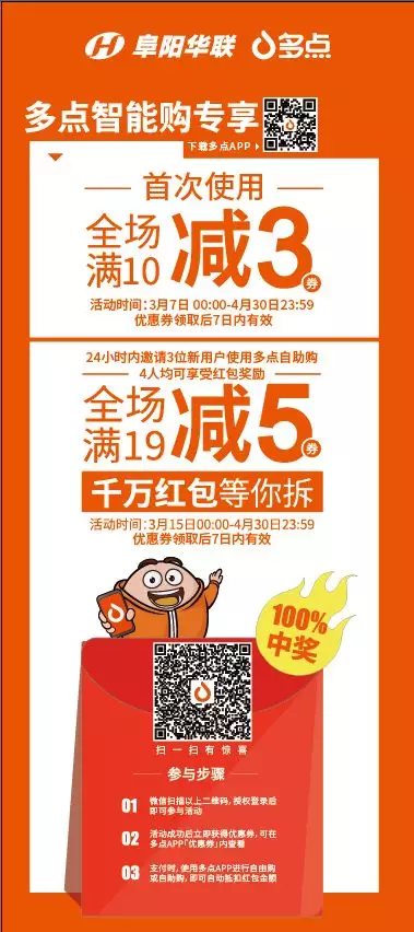活動(dòng)細(xì)則:1、多點(diǎn)用戶在阜陽(yáng)華聯(lián)門店,微信掃描海報(bào)上的小程序碼,領(lǐng)取價(jià)值12元微信支付多點(diǎn)優(yōu)惠券1張;數(shù)量有限,領(lǐng)完為止。