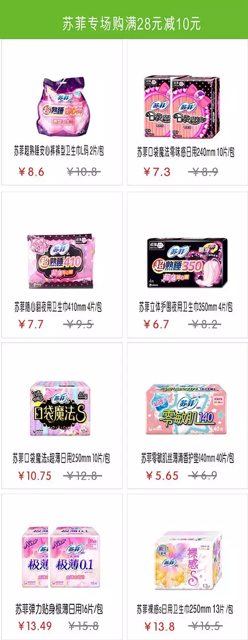 一:蘇菲專場購物滿28元立減10元