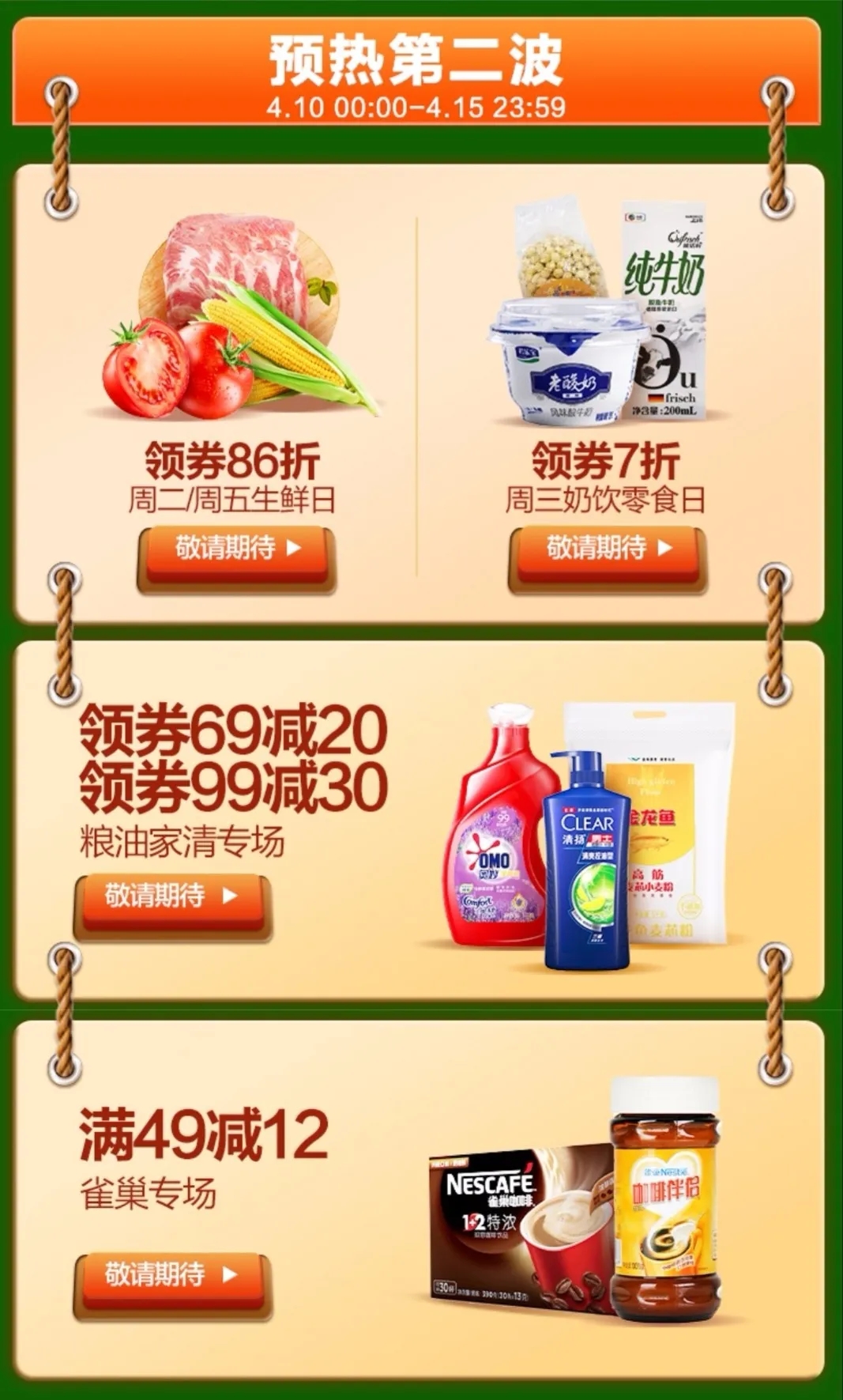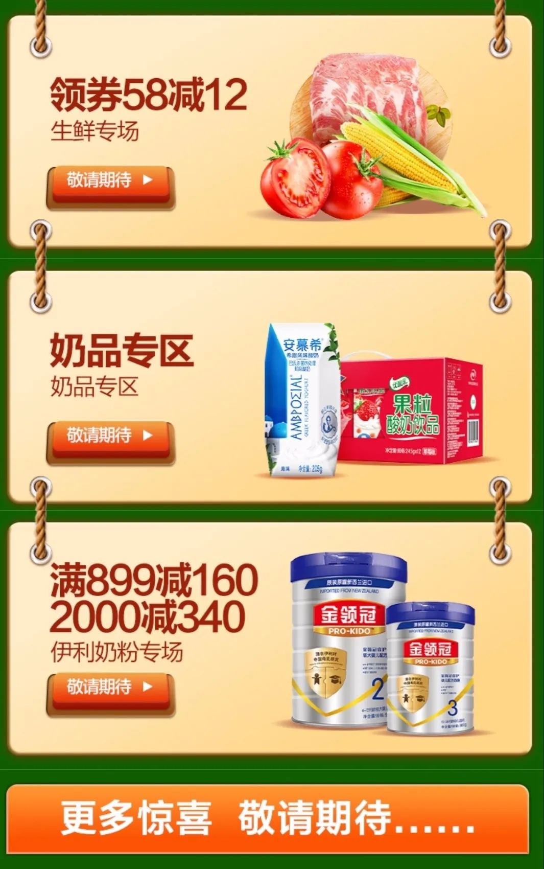 生鮮、奶飲零食、糧油、折扣區(qū)