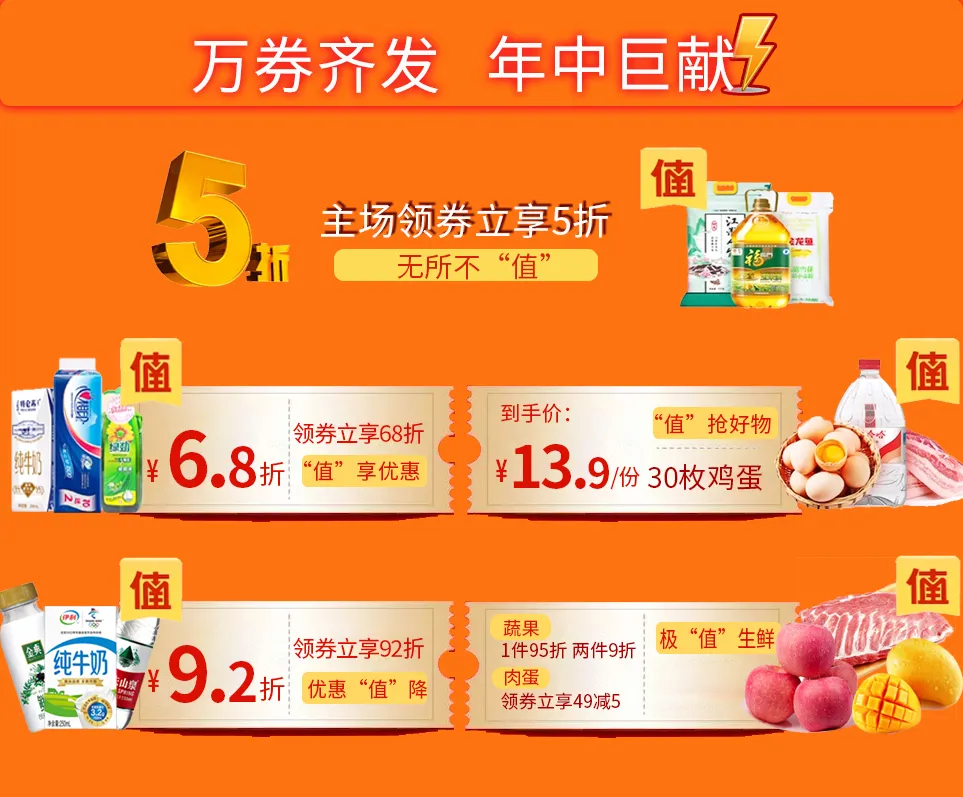 本次線上大促涵蓋豐富:⑤折神券,⑥⑧折專場,低折生鮮,限時(shí)開搶,還有豐富驚喜等你來體驗(yàn)!