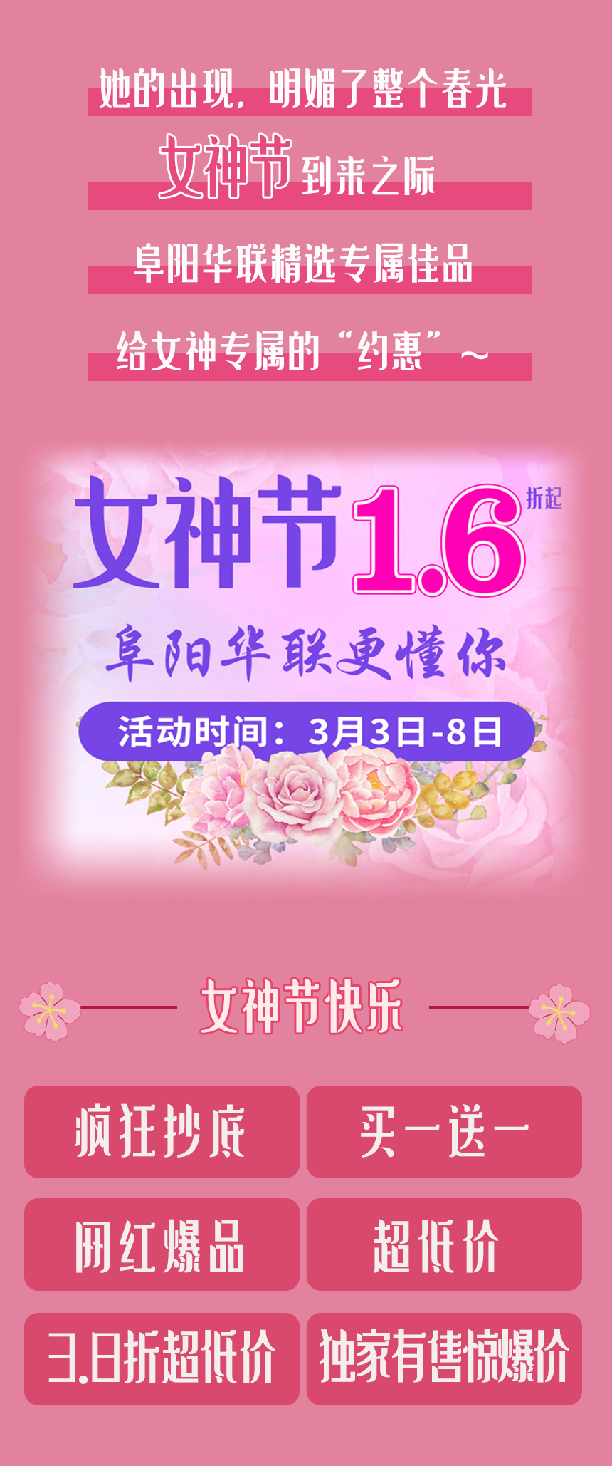 【1.6折起】阜陽華聯(lián)·女神節(jié),瘋狂抄底獨(dú)寵你~